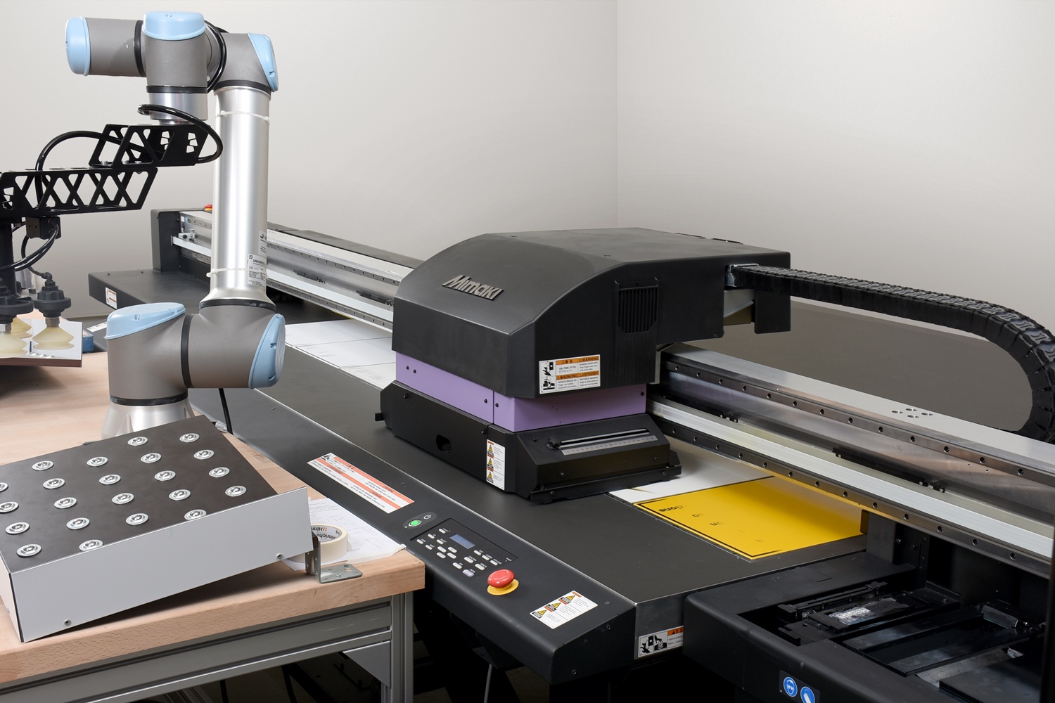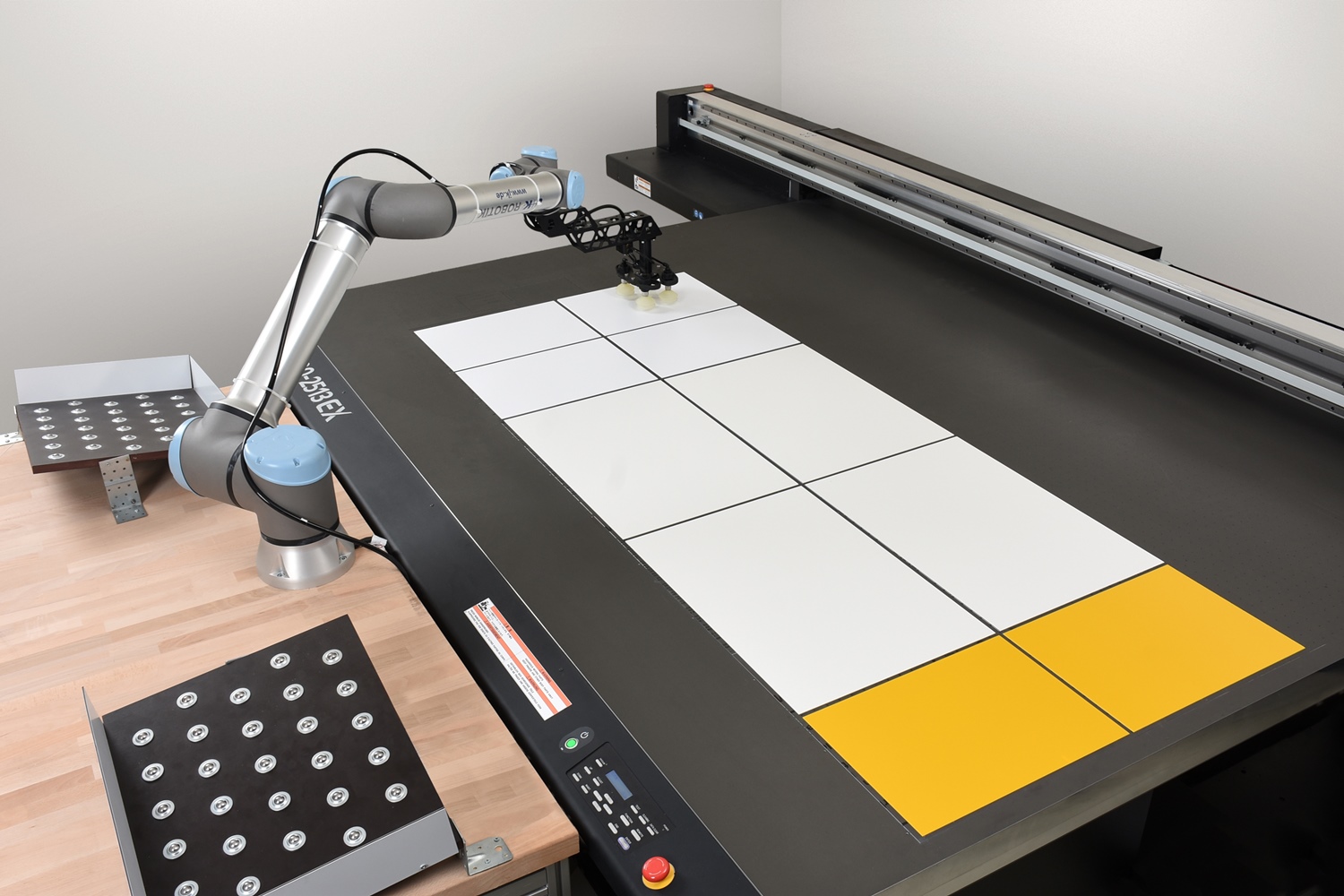 Der Roboter legt die einzelnen Rohplatten auf den Drucktisch des UV-Plattendruckers für den anschließenden 4C-Druck.