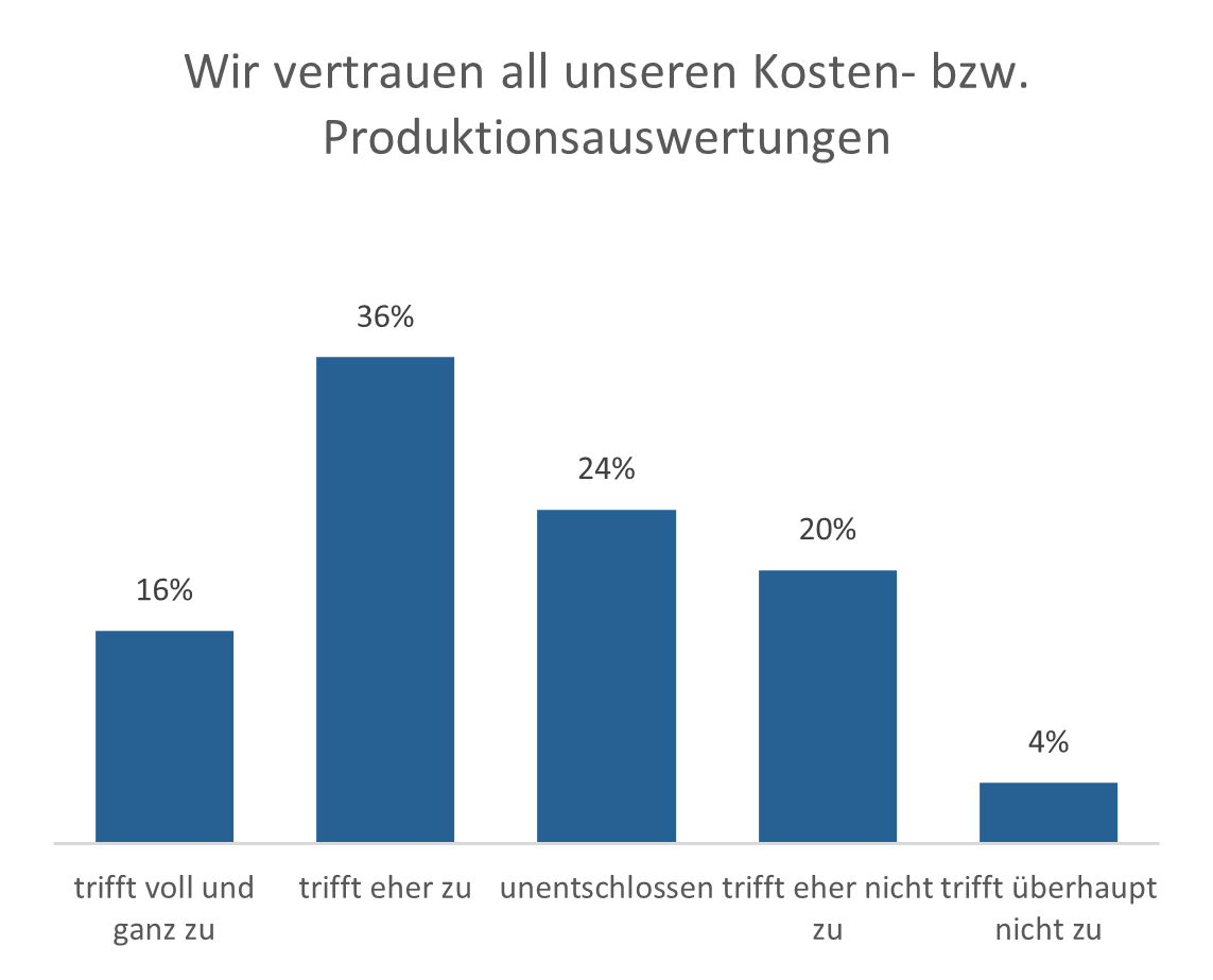 16 Prozent der Unternehmen unterstützen die These, dass ihr Controlling durch die Betriebsdatenerfassung sehr stark profitiert. 46 Prozent der Teilnehmer sind hingegen nicht der Auffassung, dass ihr Controlling durch die Betriebsdatenerfassung Probleme feststellen kann.