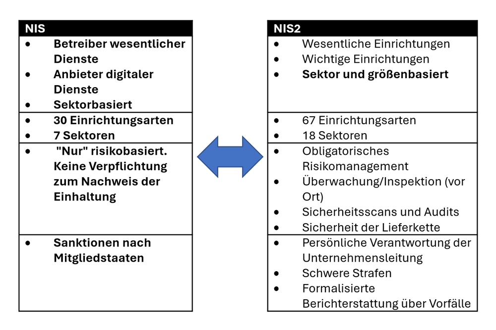 Im Gegensatz zur ursprünglichen NIS-Richtlinie führt NIS2 klare, EU-weit geltende Kriterien ein, anhand derer Einrichtungen entweder reguliert oder nicht reguliert werden. Einerseits erweitert NIS2 die regulierten Sektoren erheblich, auch in Bereiche, die nicht sofort als „kritisch“ betrachtet würden. Andererseits ersetzt NIS2 die Begriffe „Betreiber wesentlicher Dienste“ und „Anbieter digitaler Dienste“ durch „Wesentliche Einrichtungen“ und „Wichtige Einrichtungen“, was den erweiterten Fokus von NIS2 über die ursprüngliche „kritische Infrastruktur“ hinaus verdeutlicht.