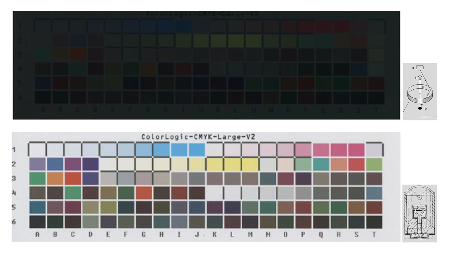 In dem hier dargestellten Experiment habe ich den Druck auf einem metallisierten Substrat simuliert. Gemessen mit zwei Farbmessgeräten unterschiedlicher Gerätegeometrie kamen dabei riesige „Wahrnehmungsunterschiede“ zum Vorschein. Während das d/8°-Gerät die gedruckten Farben relativ gut erkennen konnte, hat das 45°/0°-Messgerät infolge des unpassenden Strahlenweges sozusagen quasi nur Schwarz erkannt.