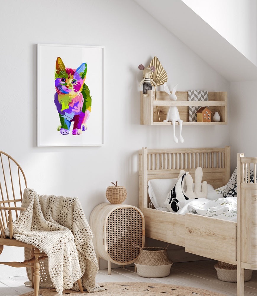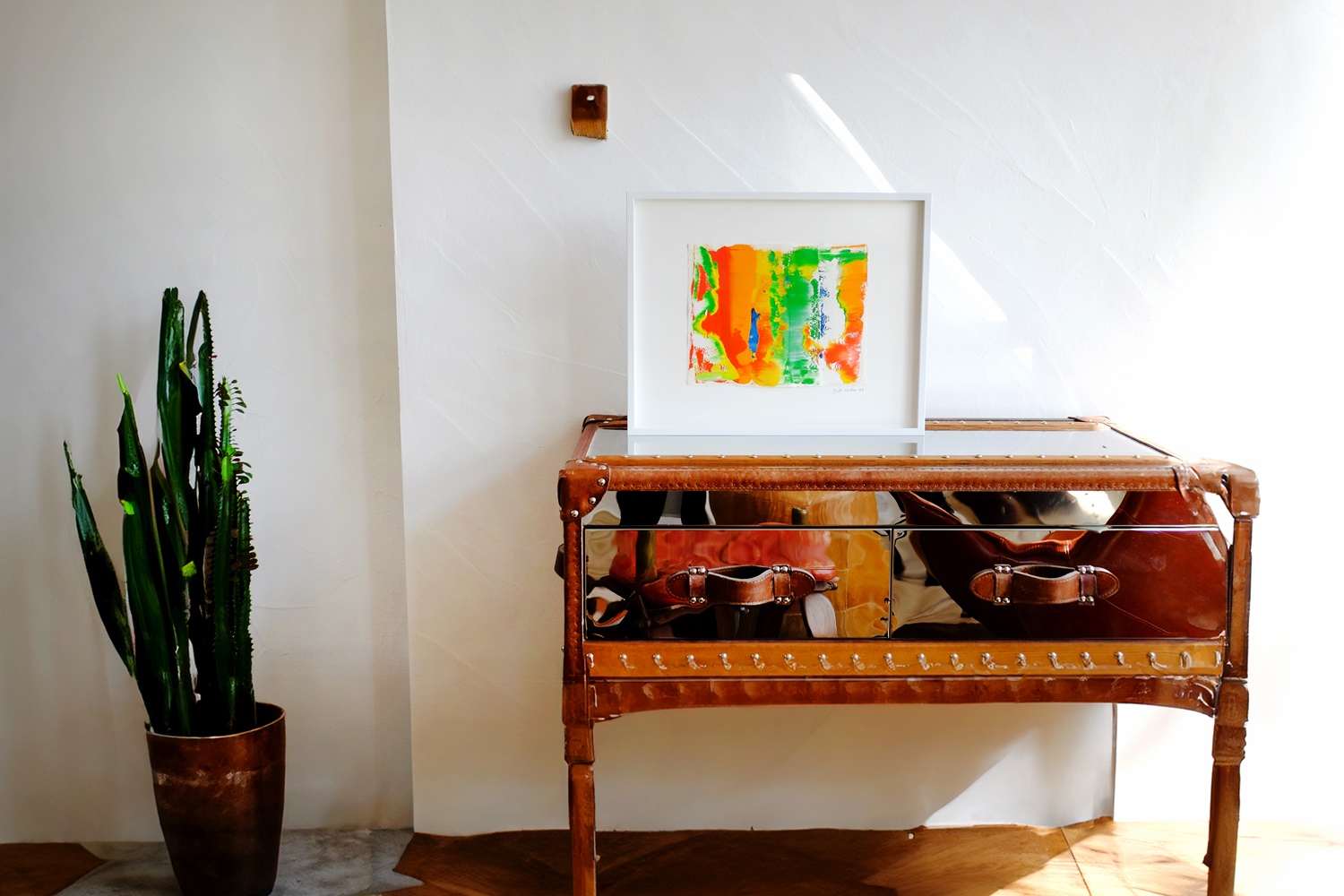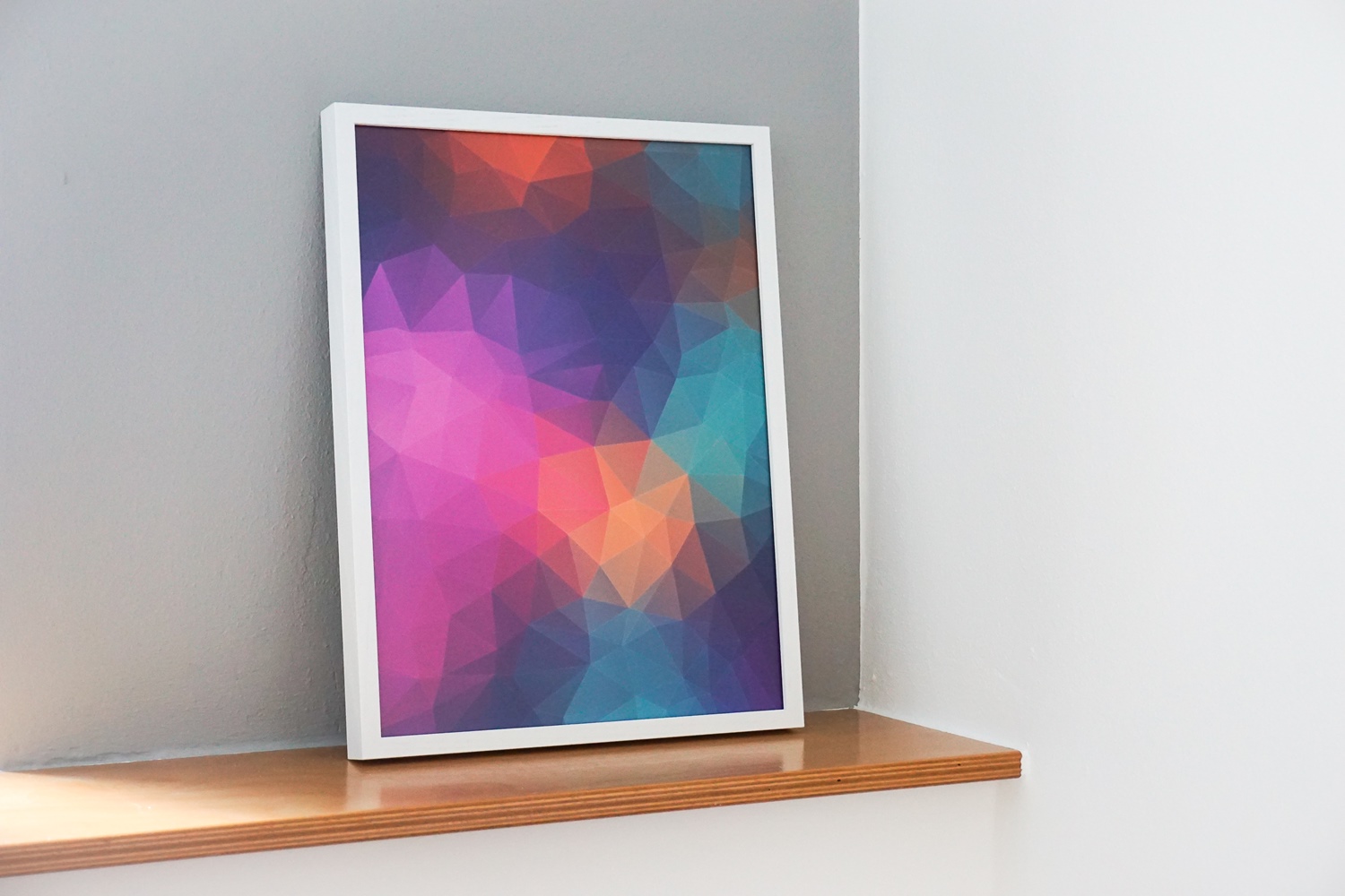 Auf einer farbigen Wand heben sich Kunstwerke in einem weißen Eichholz-Rahmen stärker ab.