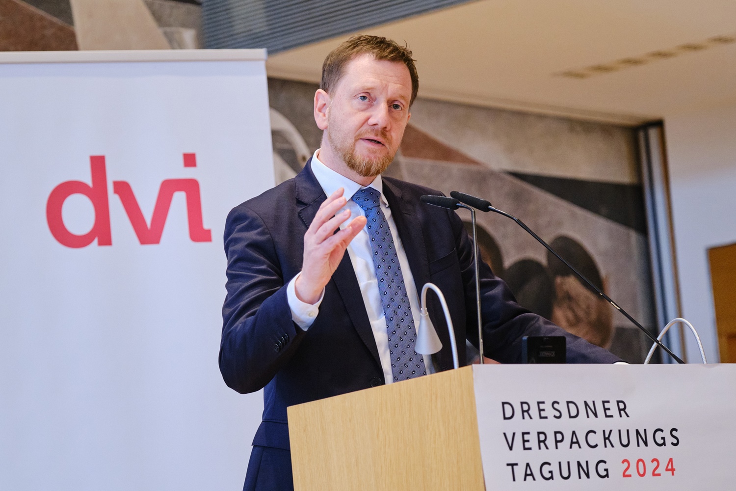 Hohen Besuch erhielt die Dresdner Verpackungstagung zum Ende des Donnerstagvormittags. Michael Kretschmer, Ministerpräsident des Freistaates Sachsen, ehrte die Branche mit einem Grußwort. Der studierte Wirtschaftsingenieur ging auf das immer schwieriger werdende Umfeld ein, in dem die Konjunkturschwäche für weniger Geld und zentrale Faktoren wie Energie und Löhne für steigende Kosten sorgten. „Wenn man teurer wird, als man besser ist, dann endet das Erfolgsmodell. Deshalb müssen wir ökonomisch erfolgreich bleiben, sonst wird das auch mit den Umweltthemen nichts“, mahnte Kretschmer. Der Ministerpräsident sprach über Infrastruktur, Digitalisierung, Bildung, Work-Life-Balance und die Aufgaben der Politik, die für all das „Rahmen und Grundlagen geben muss und nicht im Weg stehen darf“. Kretschmer schloss: „Ich finde es spannend und innovativ, was sie hier leisten. Ich wünsche uns und auch Ihrer Branche, dass wir wieder richtig auf die Beine kommen. Denn wenn es in der Verpackungsindustrie richtig gut läuft, ist das ein Zeichen, dass es insgesamt gut läuft.“